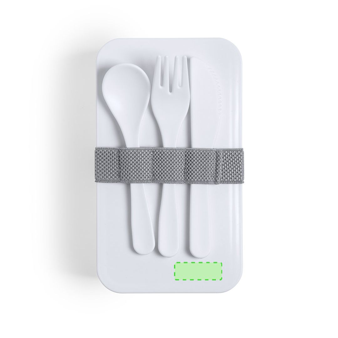 Cette lunch box en plastique durable sans BPA possède deux compartiments de 700 ml soutenus par un large élastique. Les trois couverts sont compris. Le matériau plastique a été conçu avec des propriétés antibactériennes. Il est disponible en un seul coloris. Dimensions ; 18,7 x 12,1 x 10,6 cm.