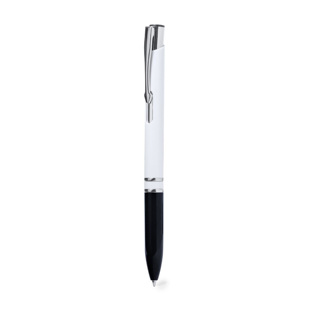 Stylo à bille fabriqué en plastique ABS résistant munie d'un mécanisme à bouton-poussoir. Tricolore avec corps blanc, poussoir et liseret argenté, pointe en 6 coloris différents au choix. L'encre est bleue à recharge Jumbo. Dimensions ; 13,7 x 1 cm.