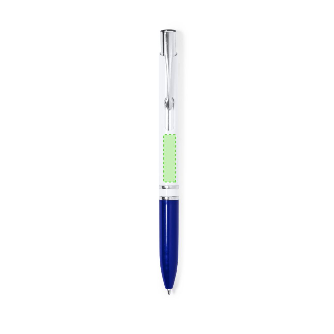 Stylo à bille fabriqué en plastique ABS résistant munie d'un mécanisme à bouton-poussoir. Tricolore avec corps blanc, poussoir et liseret argenté, pointe en 6 coloris différents au choix. L'encre est bleue à recharge Jumbo. Dimensions ; 13,7 x 1 cm.