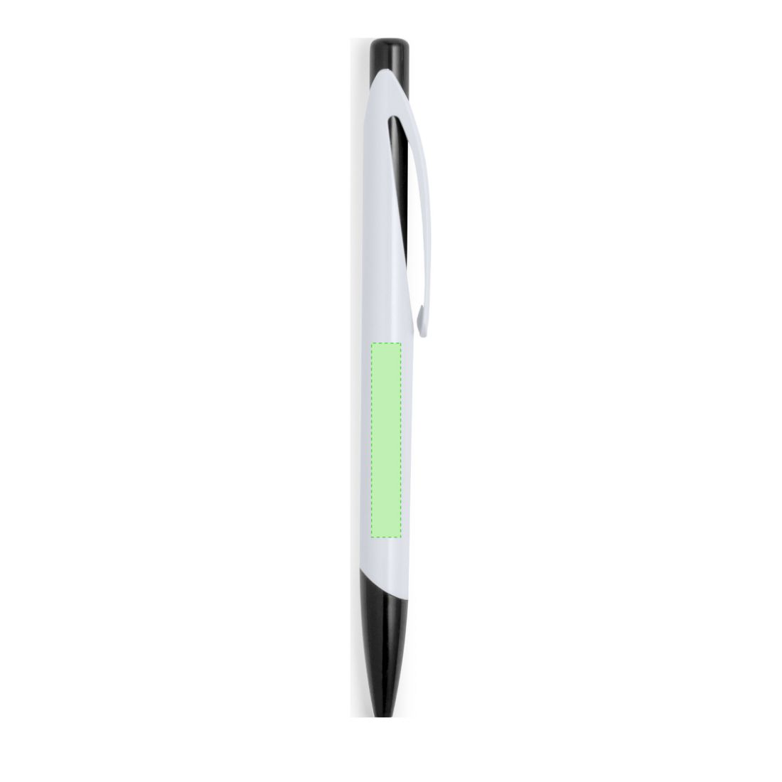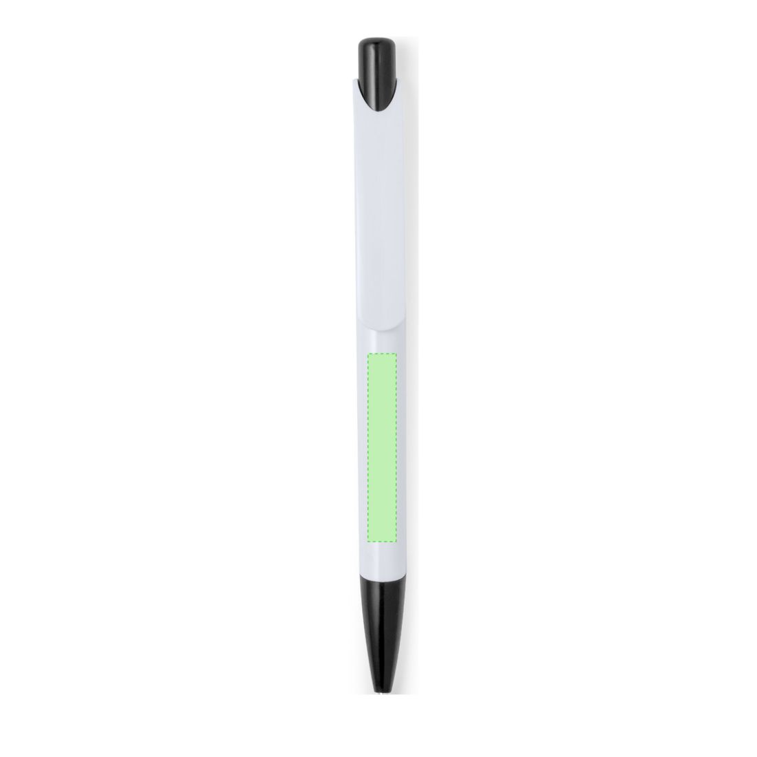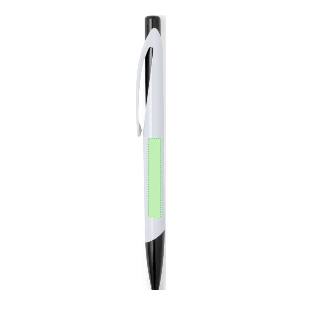 Stylo à bille bicolore en plastique avec corps blanc, bouton-poussoir et pointe colorés. Il est disponible en 8 coloris différents. L'encre est bleue. Dimensions ; 14 x 1,1 cm.